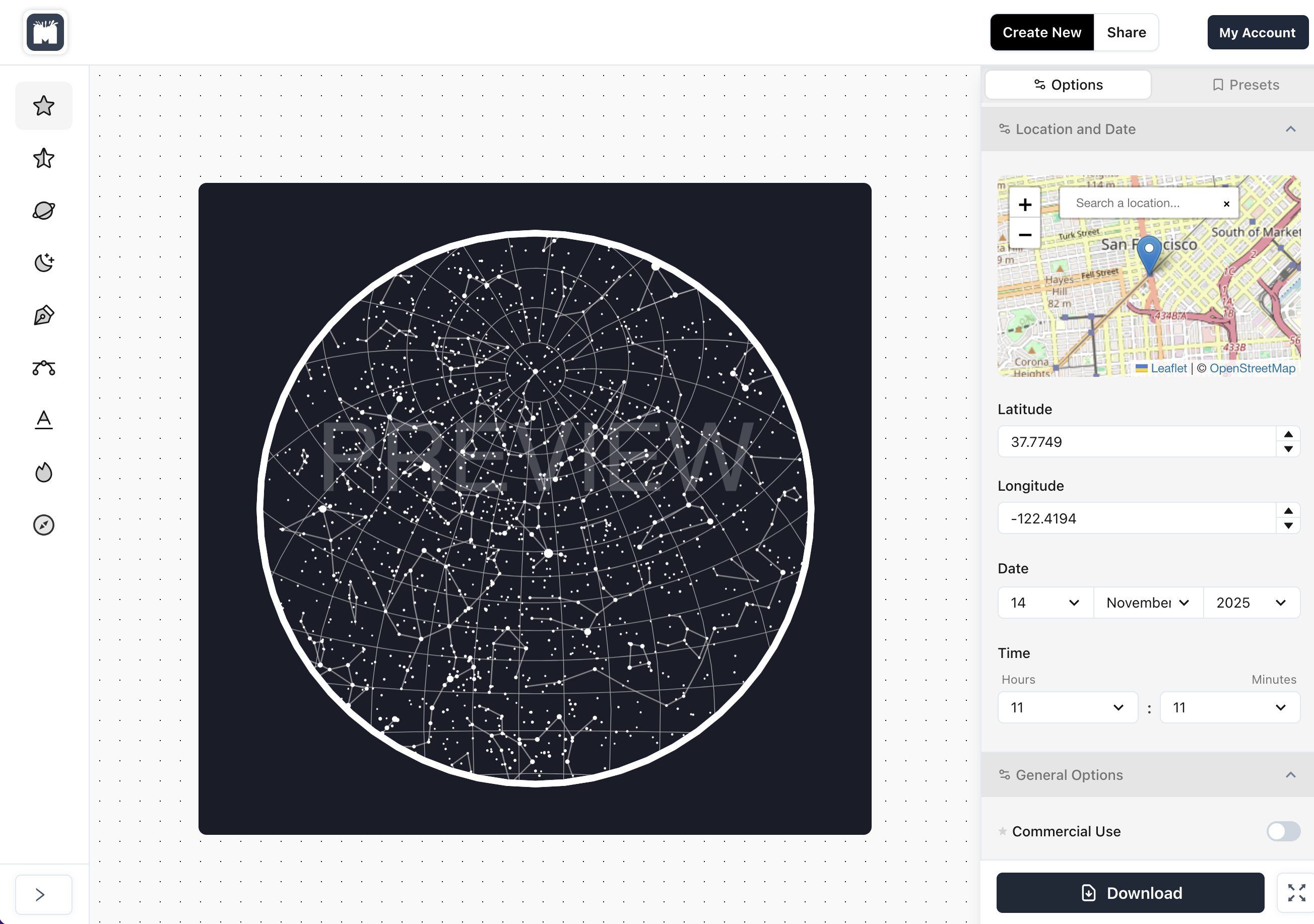 The premier solution for crafting custom star maps. Use our signature product to transform the real night sky from any date and location into unparalleled designs, prints, and gifts. Experience personalization like never before.