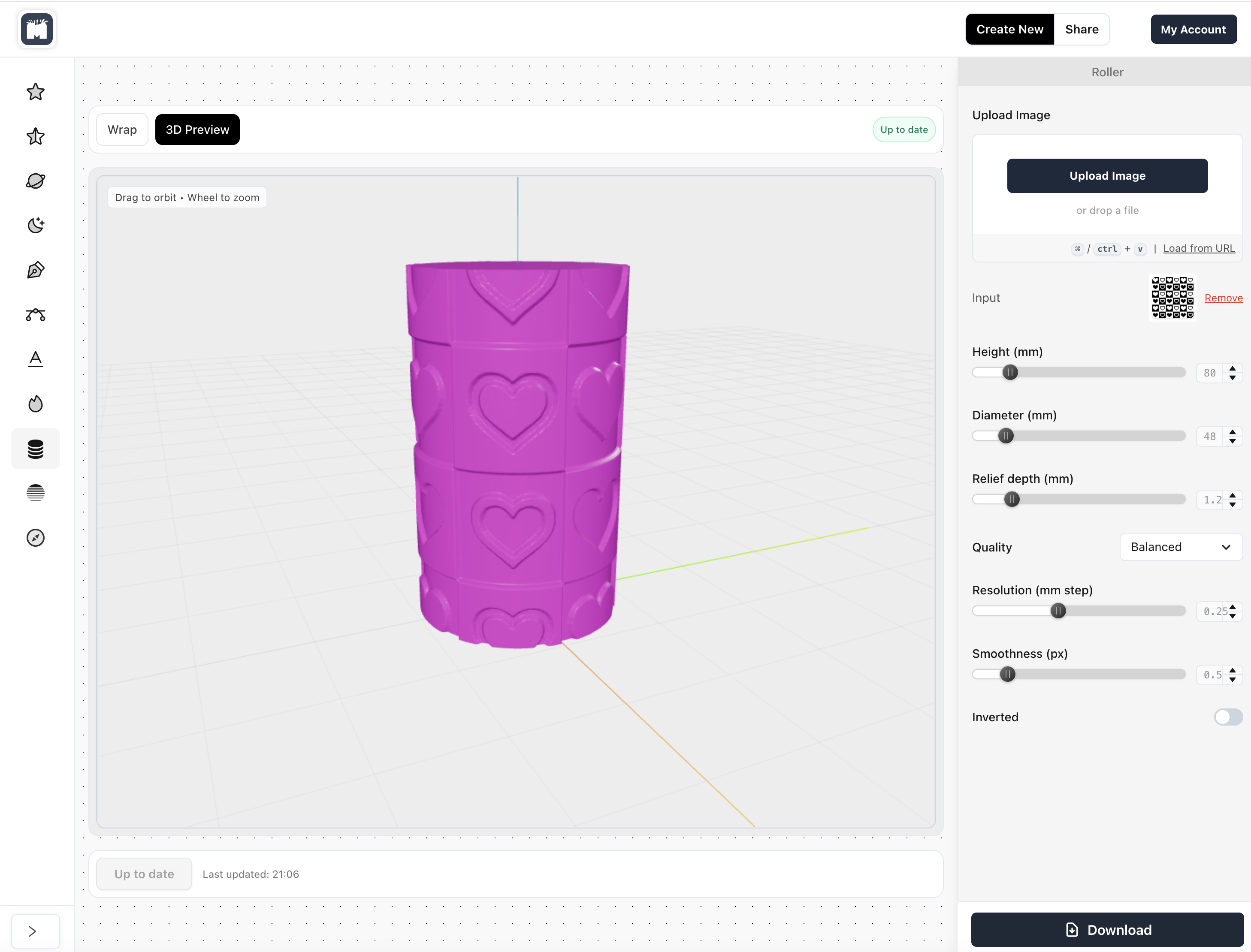 Upload a pattern, preview the wrap, generate your roller in 3D, and download a printable STL • in minutes.